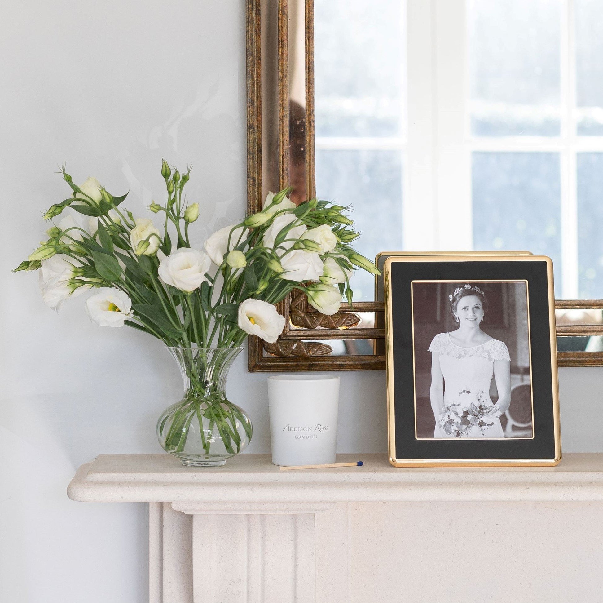 This exclusive and elegant 30mm wide enamel frame in black enamel features a soft curved gold edge. The dove grey velvet back stand has elegant round silver turn buttons and comes beautifully tissue wrapped and gift boxed in our stunning branded packaging. This frame suits all interiors, simple and elegant a perfect gift for any occasion.