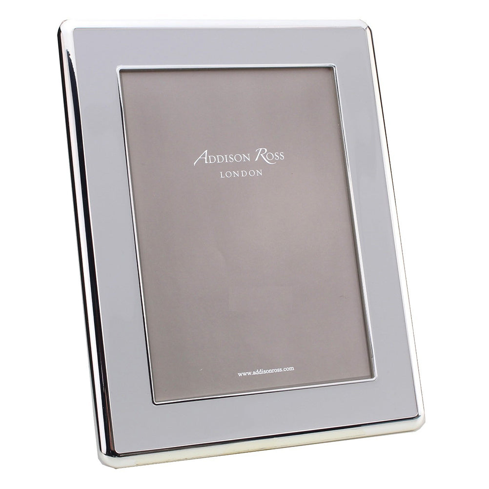 This exclusive and elegant 30mm wide enamel frame in chiffon grey enamel features a soft curved silveredge. The dove grey velvet back stand has elegant round silver turn buttons and comes beautifully tissue wrapped and gift boxed in our stunning branded packaging. This frame suits all interiors, simple and elegant a perfect gift for any occasion.