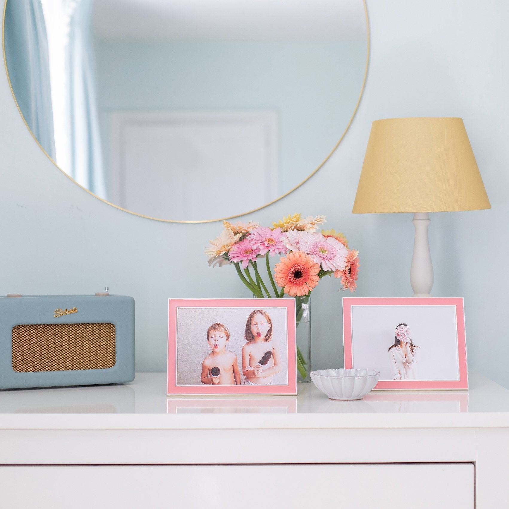 This exclusive Addison Ross designed coral enamel and silver 15mm frame sets off both colour and black and white photos beautifully. Group them to make an impressive statement. Able to stand both Landscape and Portrait.