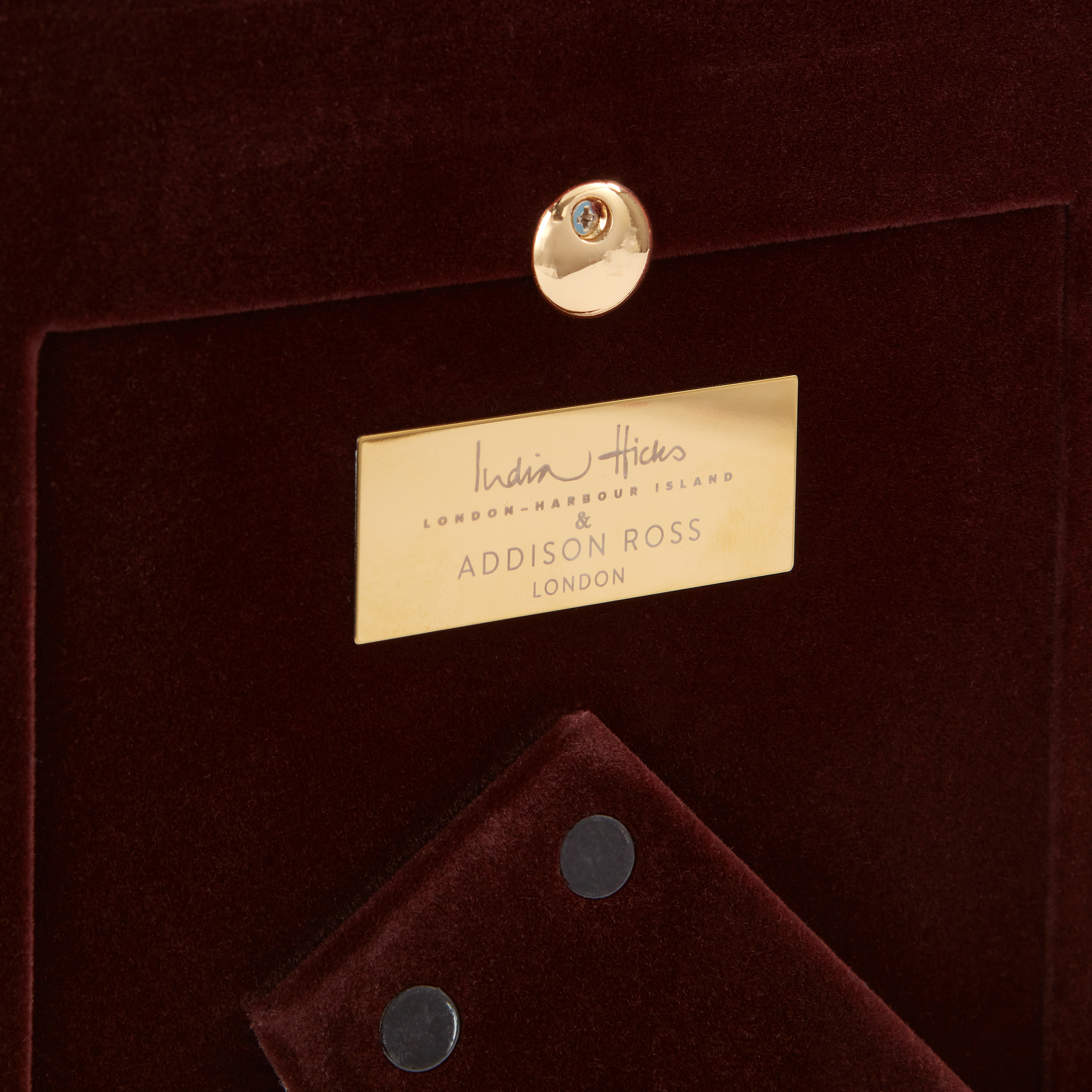 Our collaboration with India Hicks, captures the essence of her childhood holidays in Ireland. These velvet frames bring to mind a luxurious moment of calm beside a roaring fire with a hot chocolate in hand after a long windy afternoon walk . In sharp contrast the face paper and gift box show off many of the senses and scenes from India’s Island Life, shells, sunsets, spiderliliys amongst flamingo’s and butterflies, her pet parrot Jena and beloved dachshund Banger standing proud amongst the palm fronds and an early map of the Bahamas. This frame is suitable for a 5x7" photo, able to stand landscape or portrait. Overall Size is 29 x 24 cm