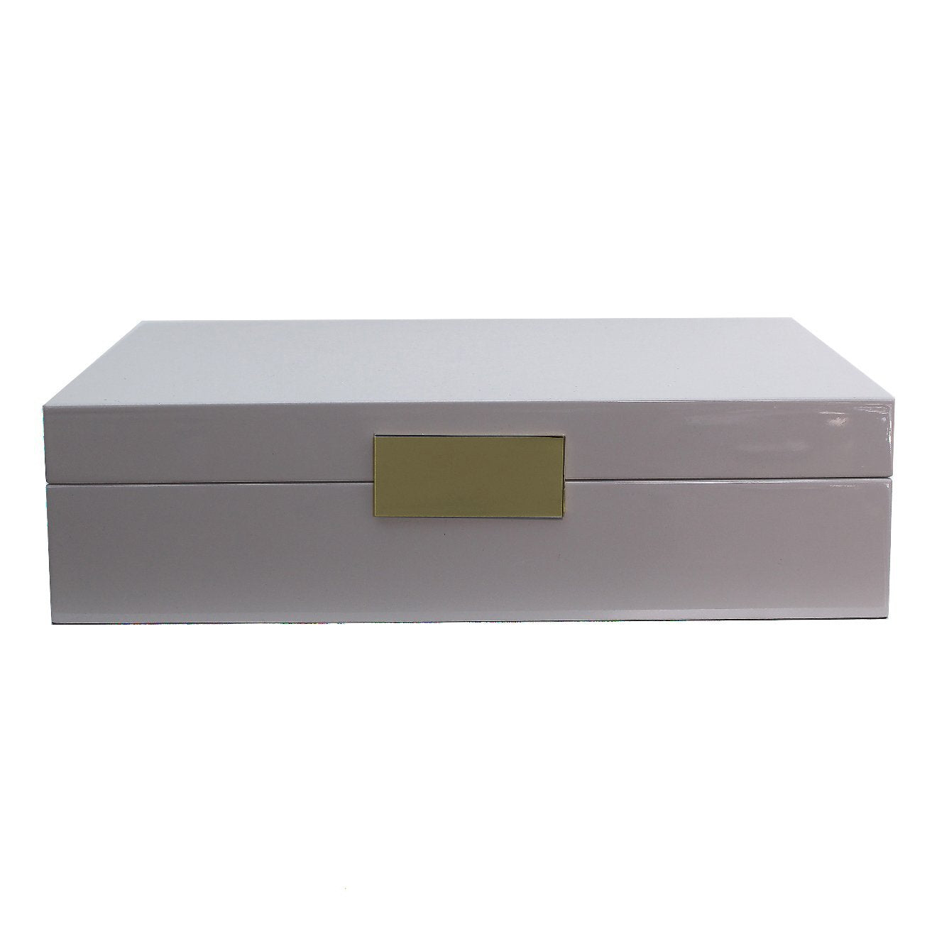 This stunning high gloss Chiffon Grey Box measures approximately 8 x 10.75 inches and features a gold plated clasp with matching hinges. All of our boxes have had 20 coats of lustrous polished lacquer.