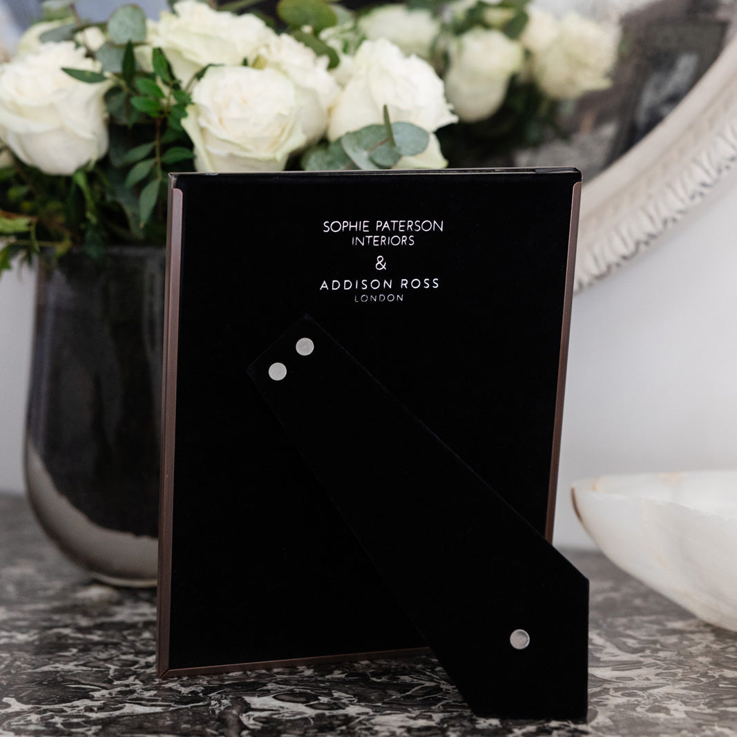 In collaboration with Sophie Paterson, this frame is a marriage of tactile woven textures in this rich dark navy encased in a luxurious bronze frame. Finished with a slide in black velvet back stand, able to stand both portrait and landscape and beautifully gift boxed. This frame is suitable for a 5x7" photo, please allow up to 5mm overlap on each edge of your photo. Clean with a soft dry cloth. Please do not leave in direct prolonged sunlight.