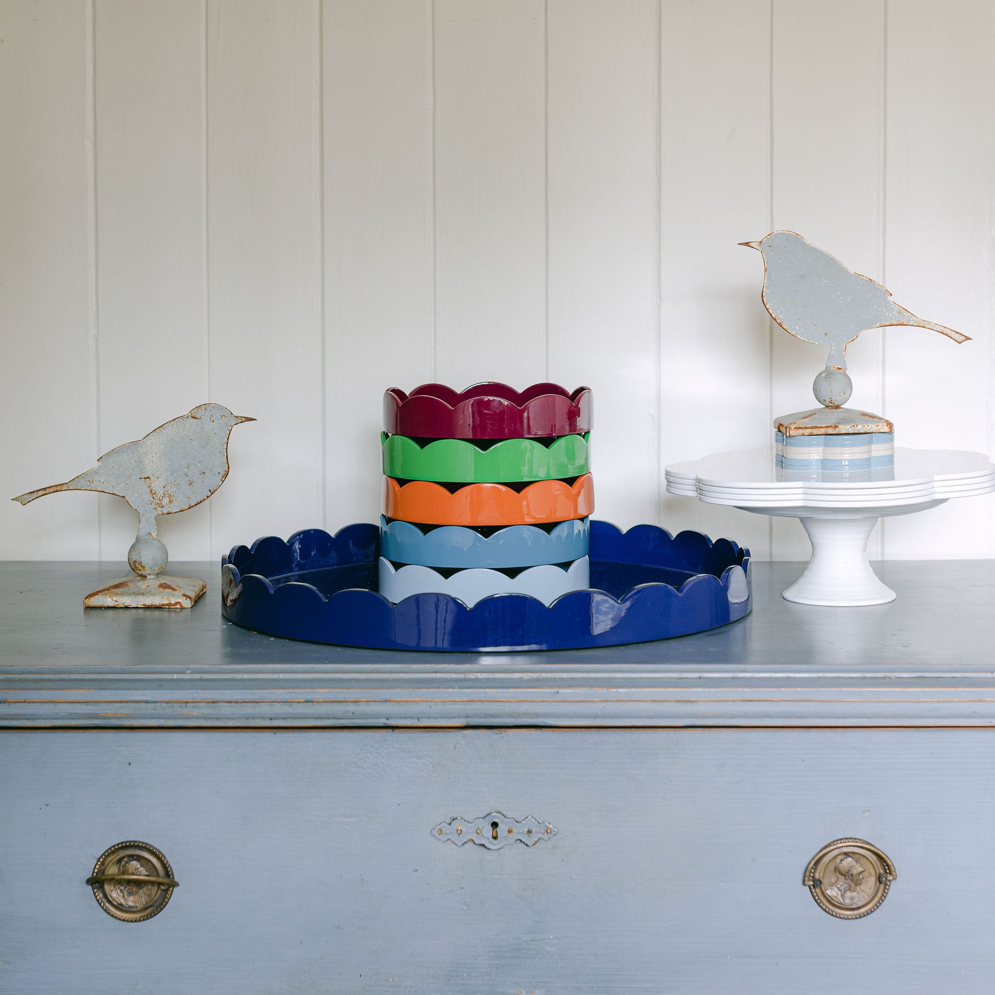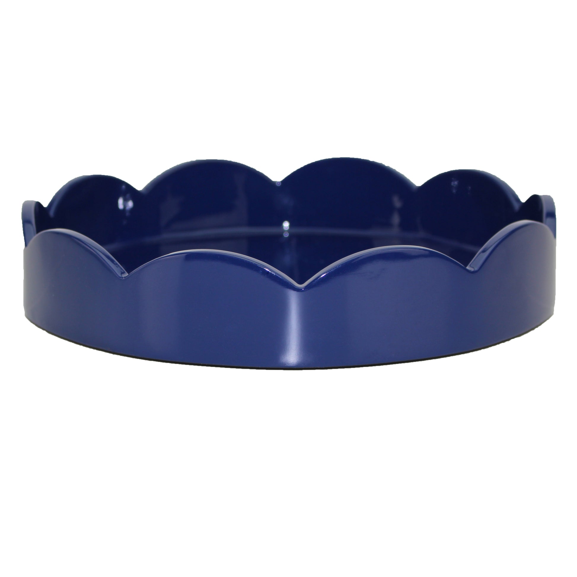 A pretty navy blue round scallop small tray finished in 20 coats of high gloss lacquer, hand polished between each coat. The base is painted black satin and embossed with our logo.