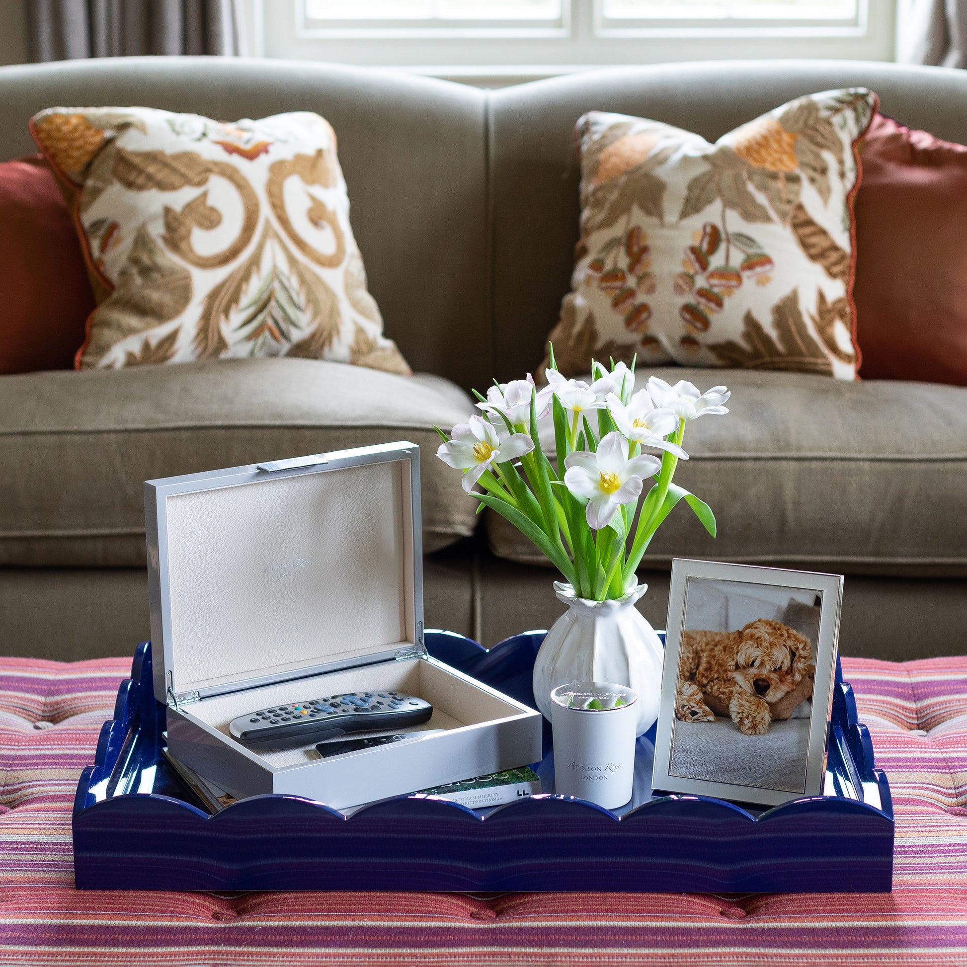 Our Navy Scalloped Straight Sided Ottoman Tray is finished with 20 coats of high gloss lacquer, hand polished between each coat. With extra long handles this tray is a truly stunning addition to any interior.