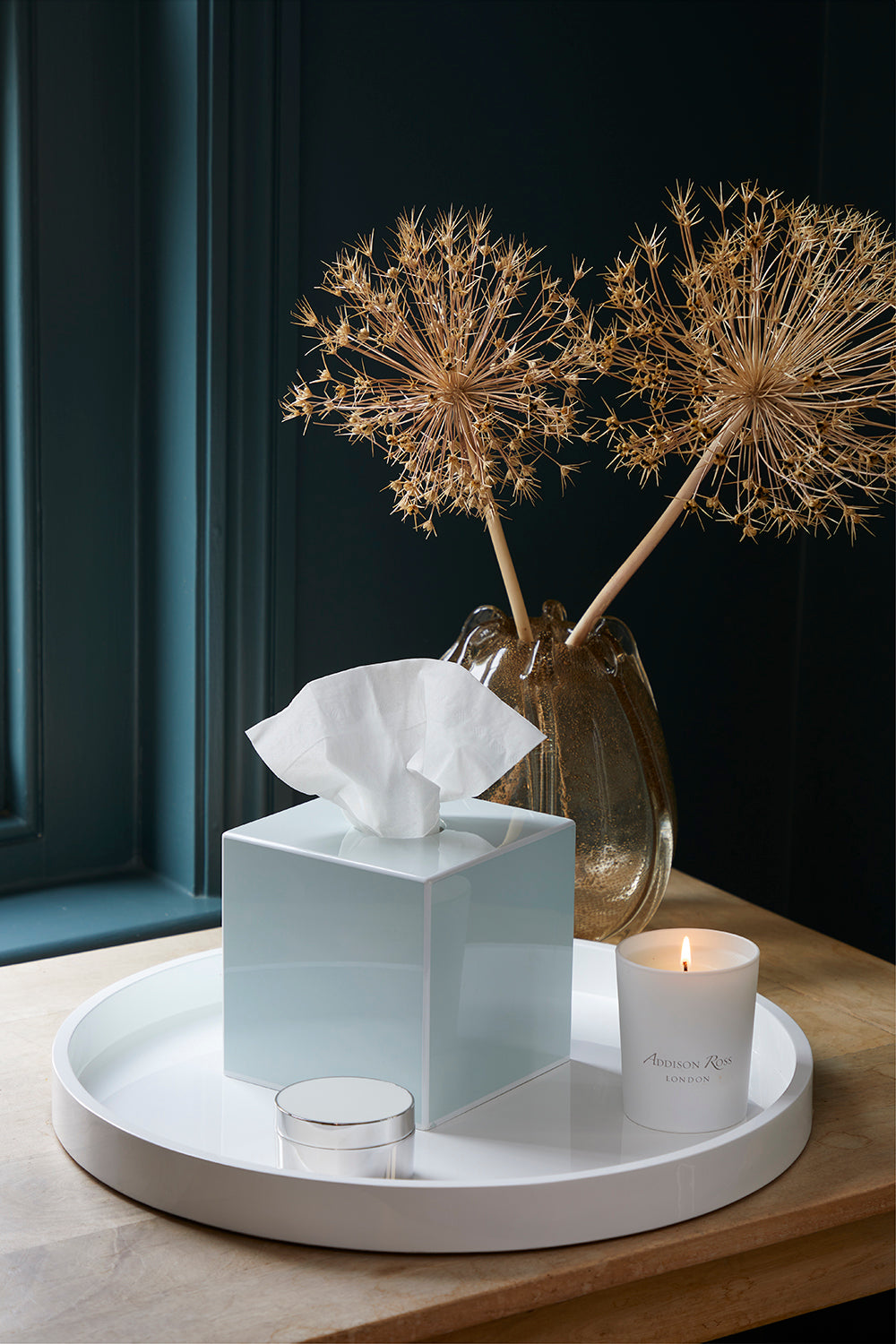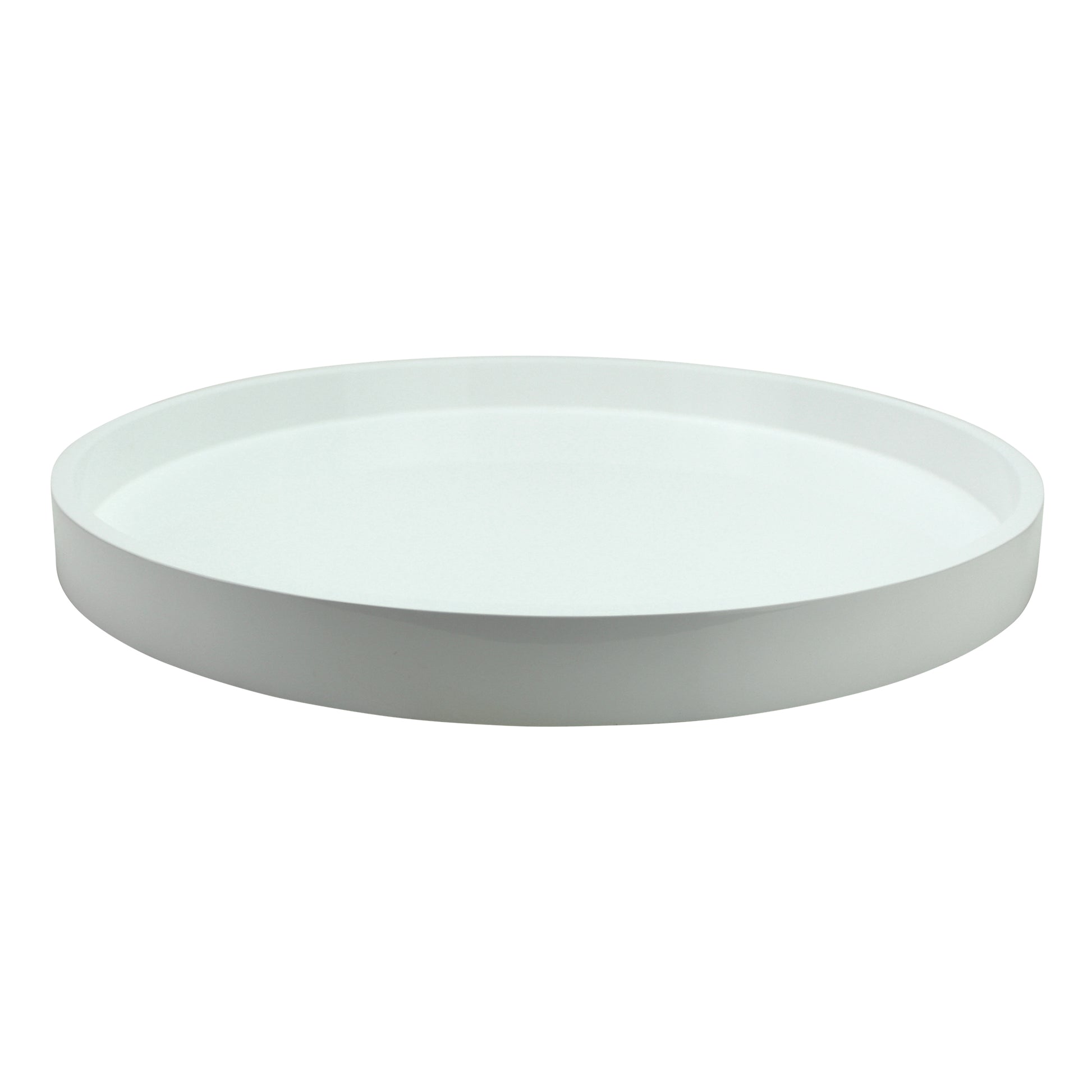 An elegant white round lacquer tray suitable for serving or styling. Each tray is made from wood coated with 20 coats of high gloss lacquer, hand polished between each coat. The base of the tray has a matt black finish embossed with our logo.